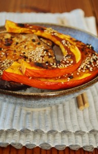 250 g de riz semi-complet – Légumes, selon la saison : 2 grosses aubergines OU 1 potimarron, ou moitié-moitié – 2 c. à café bombées de miso – 2 c. à café bombées de miel liquide – 5 c. à soupe de vinaigre de riz – 2 c. à soupe d’huile de sésame – 3 c. à soupe de graines de sésame – Sauce de soja pour servir.