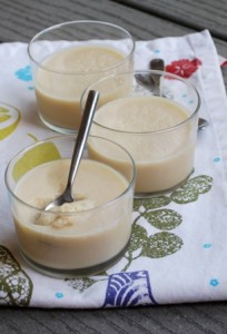 Peler les pommes et les poires. Ôter les trognons et couper en morceaux. Placer dans une casserole (avec les épices et fruits confits si on en utilise) avec un tout petit peu d’eau (2 ou 3 c. à soupe). Cuire à l’étouffée (à couvert, sur feu doux) pendant 15 mn, jusqu’à ce que les fruits commencent à se défaire. Placer dans le bol du mixeur et mixer avec la purée d’amande (facultative). Dans la casserole, verser le lait d’amande. Ajouter l’agar-agar en pluie. Tout en remuant doucement, porter à ébullition. Laisser frémir pendant environ 10 – 15 secondes, puis verser dans le mixeur et mixer avec la purée de fruits. Répartir dans des ramequins ou des petits verres. Laisser tiédir à température ambiante, puis placer au réfrigérateur pendant 2h au moins. Servir ultra-frais.