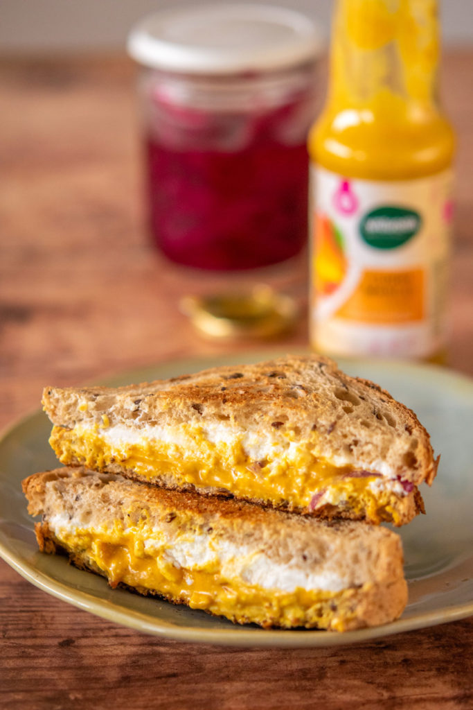 4 tranches de pain de mie complet – Sauce au curry et à la mangue – Fromage frais (ici, fromage de chèvre)