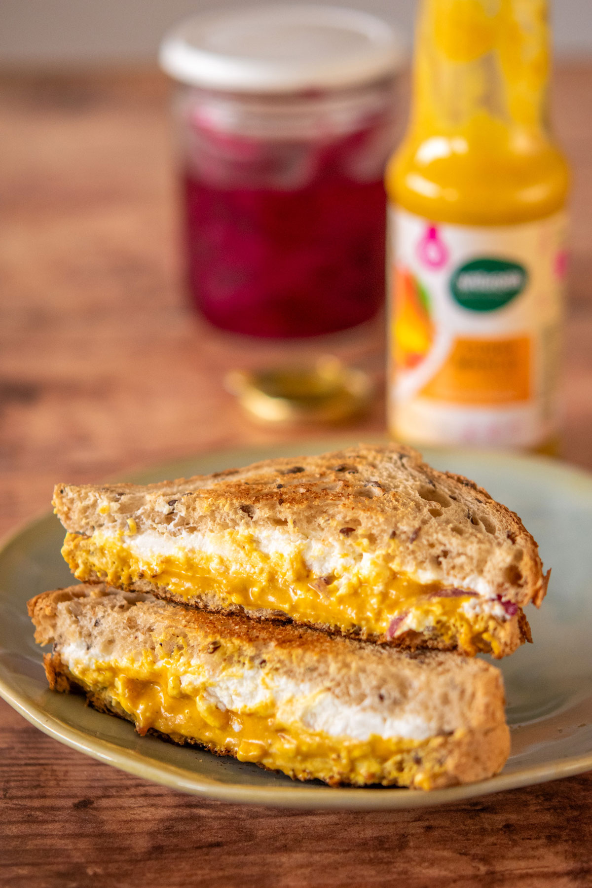 Disposer le fromage de votre choix sur les tranches de pain de mie. Par-dessus, déposer des cuillerées de sauce au curry et à la mangue. Refermer avec une deuxième tranche de pain et chauffer dans une poêle quelques minutes de chaque côté.