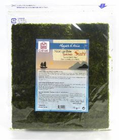 L’algue nori pour rouler les makis, on connait.Présentée en grandes feuilles carrées, elle a une saveur finement salée, et gagne en complexité après un léger toastage au-dessus d’une flamme… pour les plus motivés. La nouveauté qui rend service, c’est une algue nori déjà grillée (Celnat, toujours).