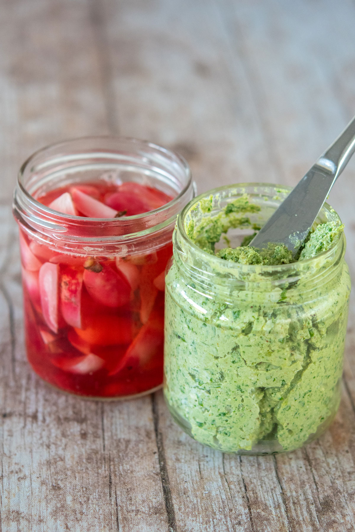 Bien laver une botte de radis (garder les fanes à part). Couper les queues des radis et les trancher en 4 dans la longueur. Placer dans une petite casserole avec 50 g de sucre blond, 50 g d’eau et 100 g de vinaigre de cidre. Couvrir, porter à ébullition puis éteindre le feu. Verser dans un bocal, fermer et laisser refroidir avant de placer au frigo. Conservation : un mois.