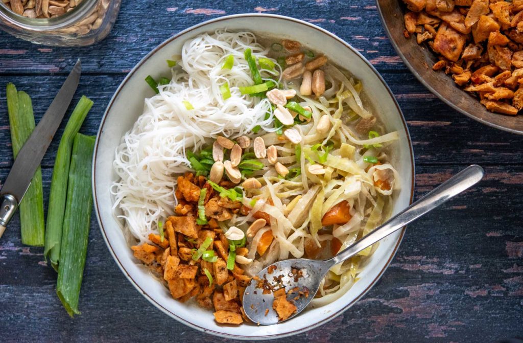 2 oignons nouveaux ou cébettes – 1/2 chou blanc – 2 carottes – 1 c. à soupe d’huile de coco – 4 c. à soupe de pâte de curry vert – 1 boîte de lait de coco à 17 % de MG – 200 g de vermicelles thaï de riz blanc ou rouge – 1 boîte d’émincés végétaux épicés – 4 c. à soupe de cacahuètes grillées non salées