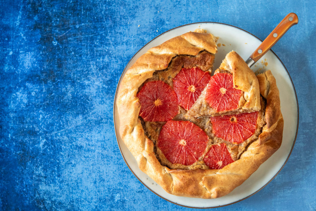 - Peler à vif les pomelos et couper en rondelles. Disposer sur la crème d’amande.