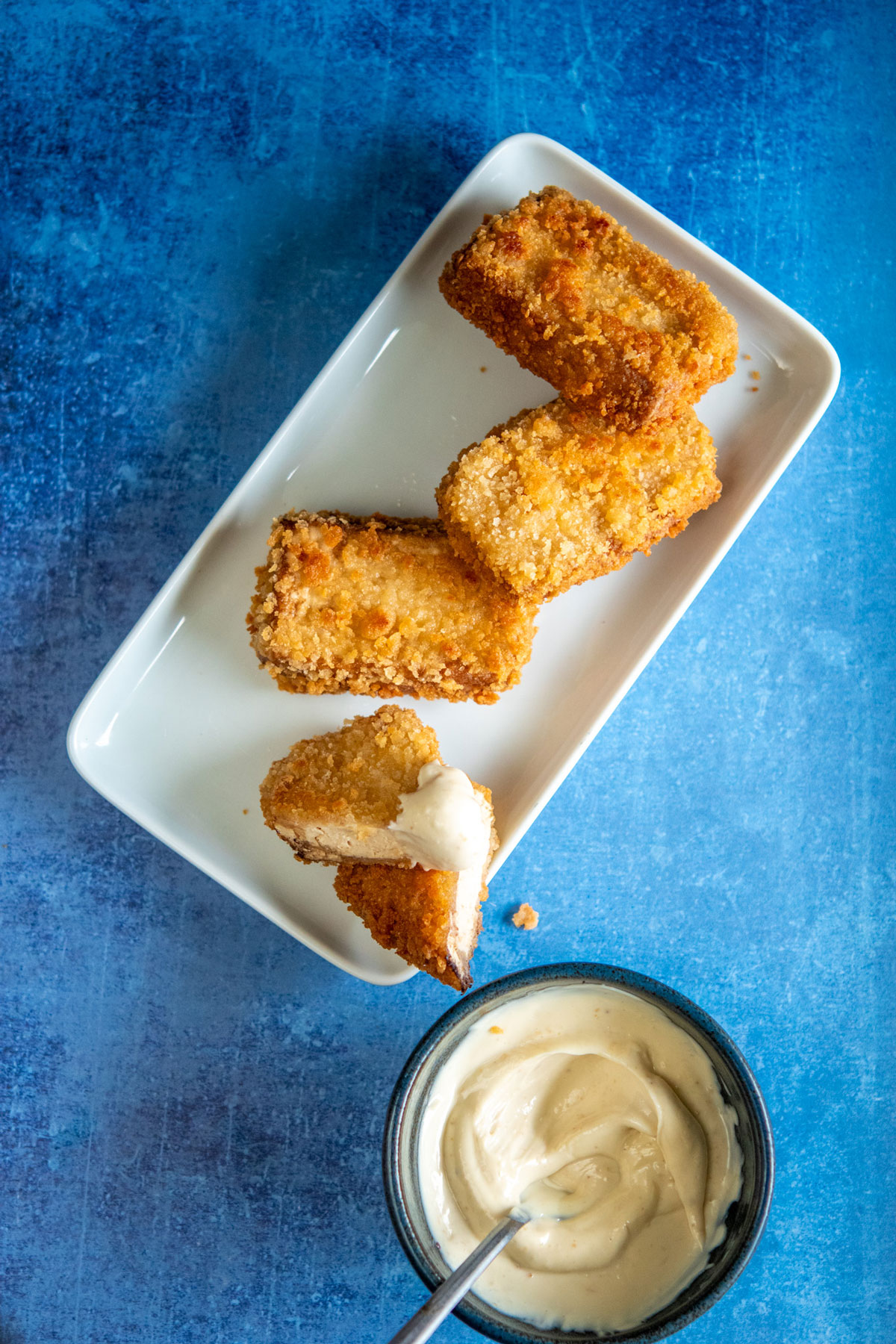 2 blocs de tofu fumé (250 g) – 3 c. à soupe de fécule de maïs – 1 pincée d’ail en poudre – Chapelure panko – Huile de friture – 4 c. à soupe de mayonnaise -1 c. à café de purée de yuzu