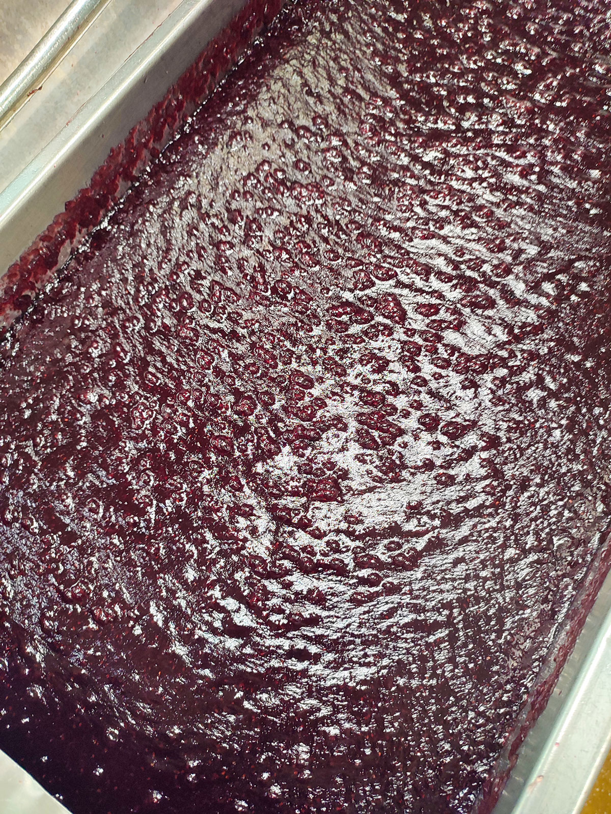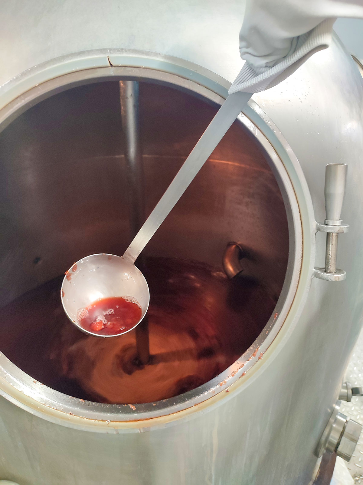 Le savoir-faire de Saveurs & fruits, c’est la cuisson douce sous vide à basse température. Voilà qui n’est pas comme à la maison : il s’agit d’évaporer l’eau tout en conservant la texture et la couleur des fruits et en concentrant leurs arômes. Pour cela, les fruits et le sucre sont d’abord chauffés au chaudron, puis le tout est placé dans une grosse boule (400 kg quand même !), pilotée de main de maître par Élodie. Cette boule va instaurer un vide d’air. À l’intérieur, la cuisson douce se poursuit sans que les arômes ne s’échappent. On vous rassure, ça sent tout de même sacrément bon dans cet atelier !